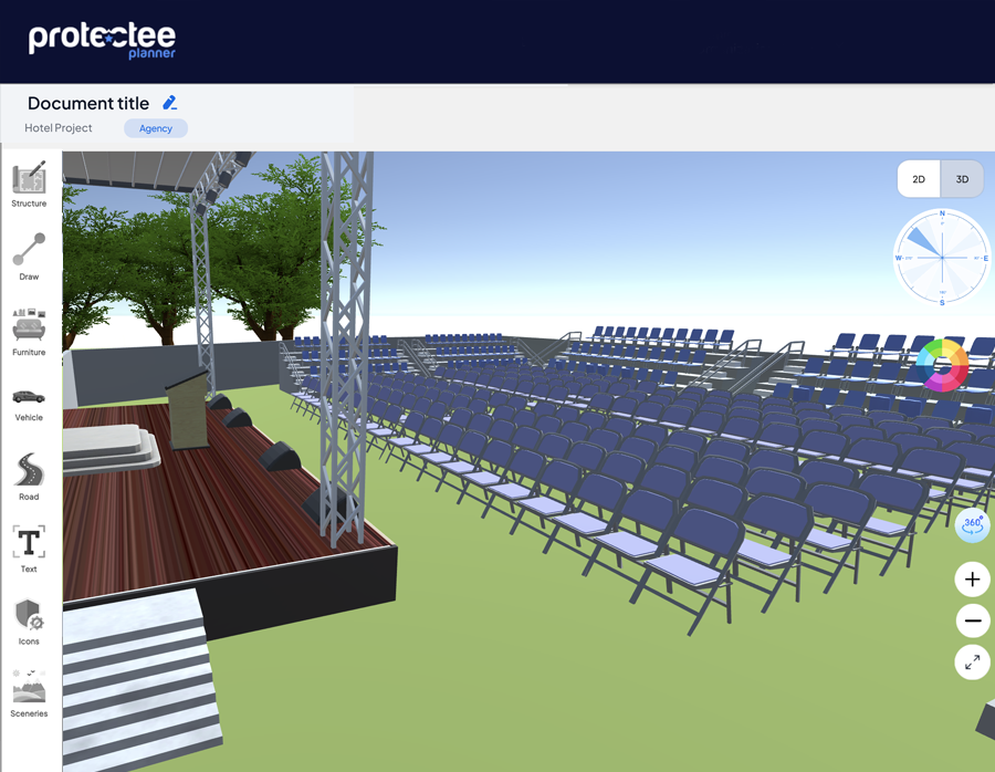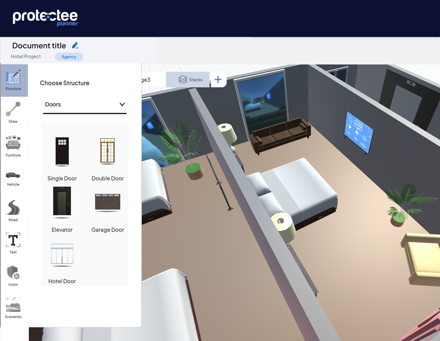 Online 2D & 3D software offers a user-friendly experience, empowering you to design spaces with a simple push-and-click, drag-and-drop interface. Imagine effortlessly arranging buildings, doors, windows, and rooms on a digital canvas. Protectee Planner software allows you to visualize your project in both 2D and 3D, providing a clear understanding of scale and layout.